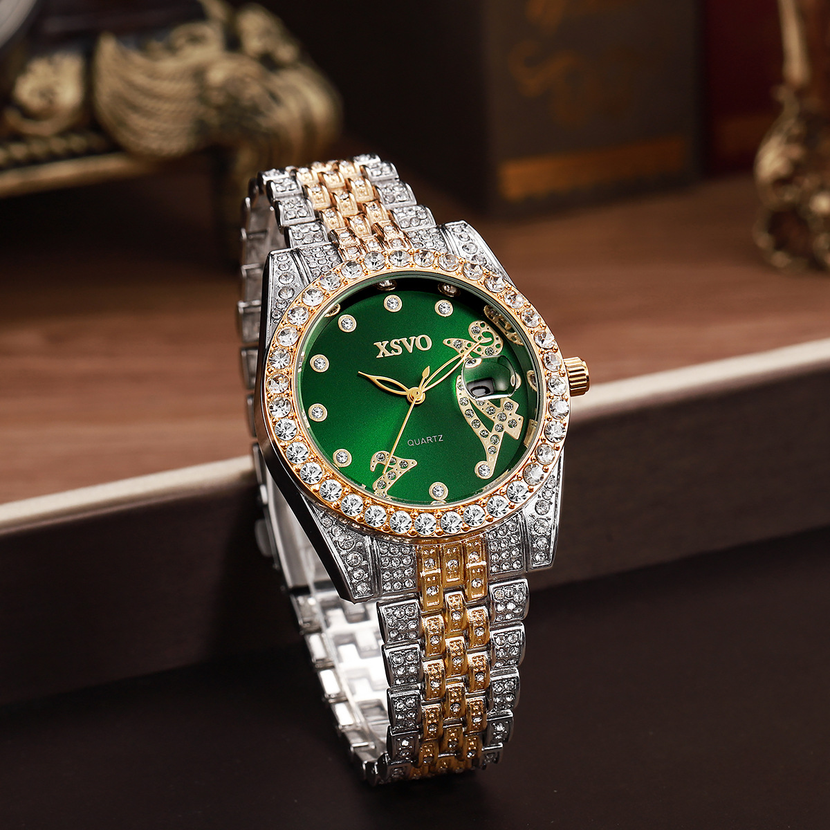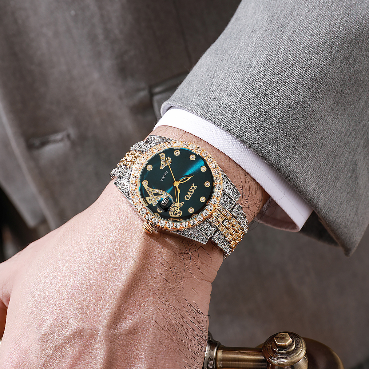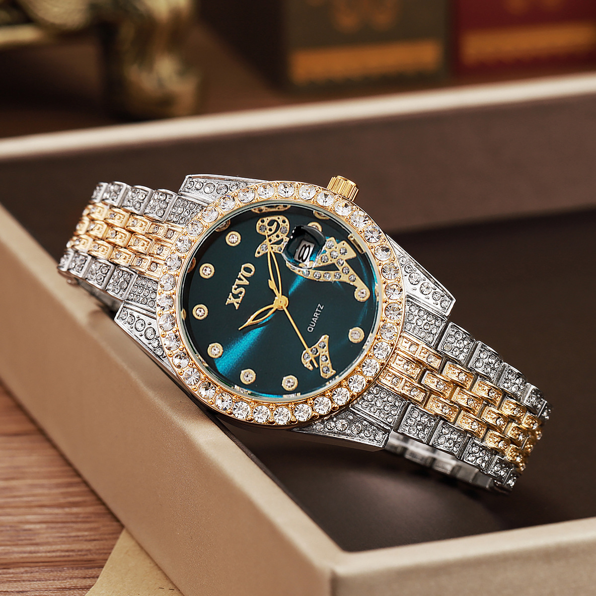 Men's Business Diamond-Set Aurora Mother-of-Pearl Dial Steel Bracelet Quartz Watch with Diamond-Set Indexes
